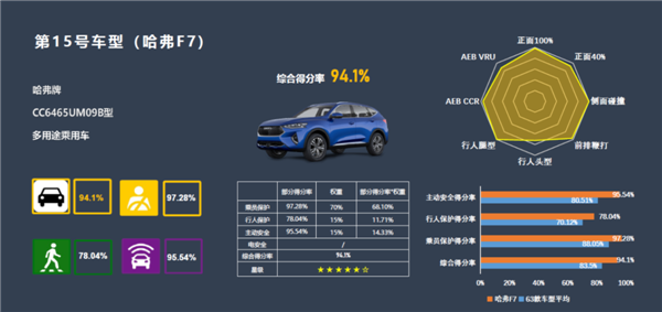 除冠军级的服务质量之外,对于用户而言,安全性同样是决定用车幸福指数的重要指标,而爱车是否能主动减低事故发生率,碰撞之际能否形成安全堡垒守护驾乘者更是衡量安全性的重要指标。而在这一方面,哈弗F7无疑有着冠绝车市的优异表现,早在今年11月,哈弗F7便在C-NCAP碰撞测试中以94.1%的综合得分率获得超五星级安全,其中在乘员保护、行人保护以及主动安全方面,哈弗F7更是获得超高评价,而潮智再进阶的2021款哈弗F7的安全性同样十分可靠。